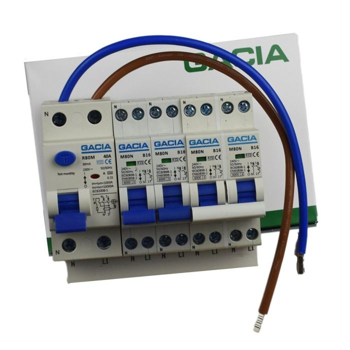 GACIA uitbreiding/combinatie- set inclusief aansluitdraden 6mm2 (l=250mm) 1x Aardlekschakelaar 2p/40A/30mA, 2x Installatieautomaat 1p+n B16, 1x kookgroep 2p+2n B16