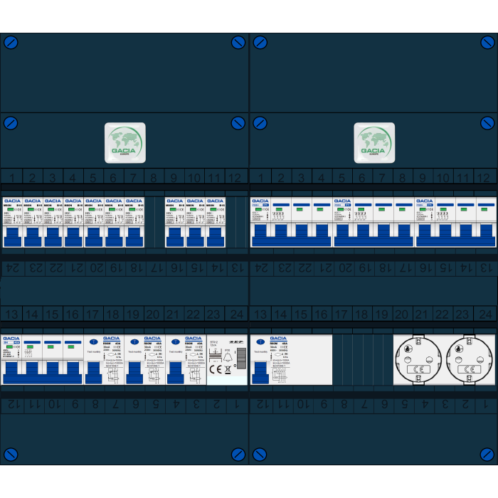 GACIA groepenkast, hoofdschakelaar, 3x aardlekschakelaar 2p/40/30mA, 1x aardlekschakelaar 4p/40A/30mA, 10x installatieautomaat 1p+n/B16, 3x installatieautomaat 3p+n/B16, beltrafo, tweevoudige contactdoos (3 fase)