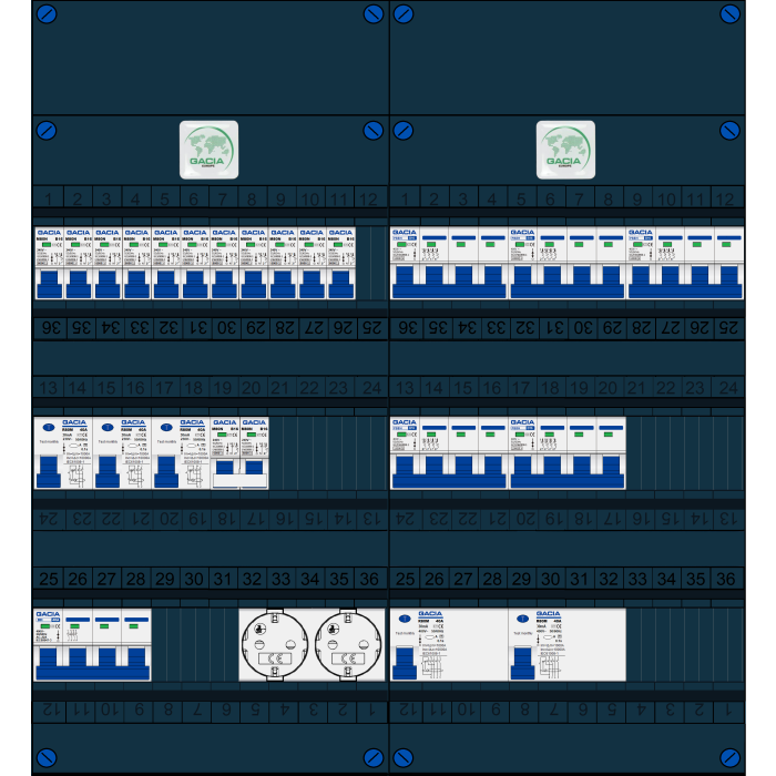 GACIA groepenkast, hoofdschakelaar, 3x aardlekschakelaar 2p/40/30mA, 2x aardlekschakelaar 4p/40A/30mA, 11x installatieautomaat 1p+n/B16, 5x installatieautomaat 3p+n/B16, kookgroep 2p+2n/B16, tweevoudige contactdoos (3 fase)