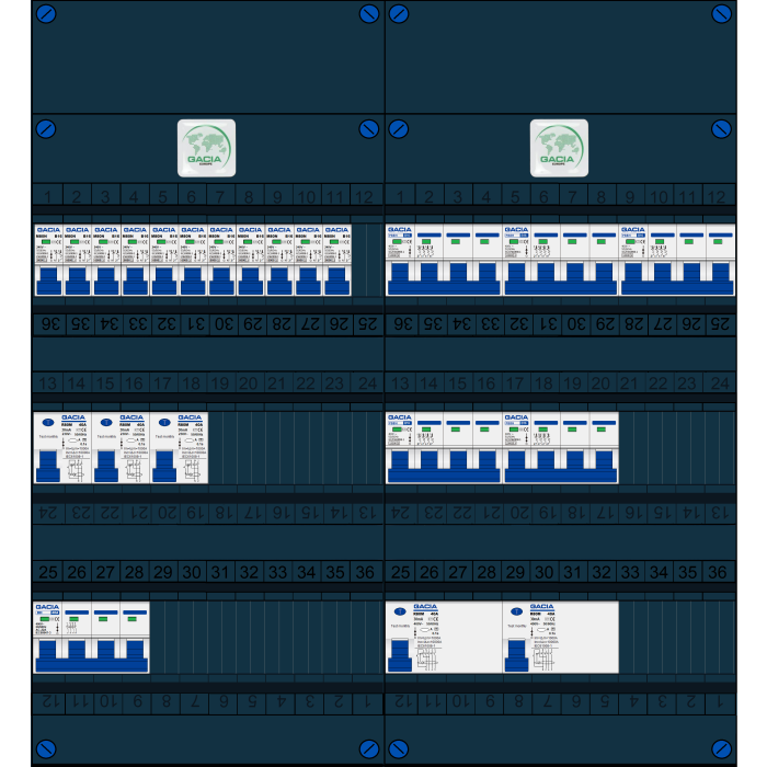 GACIA groepenkast, hoofdschakelaar, 3x aardlekschakelaar 2p/40/30mA, 2x aardlekschakelaar 4p/40A/30mA, 11x installatieautomaat 1p+n/B16, 5x installatieautomaat 3p+n/B16 (3 fase)