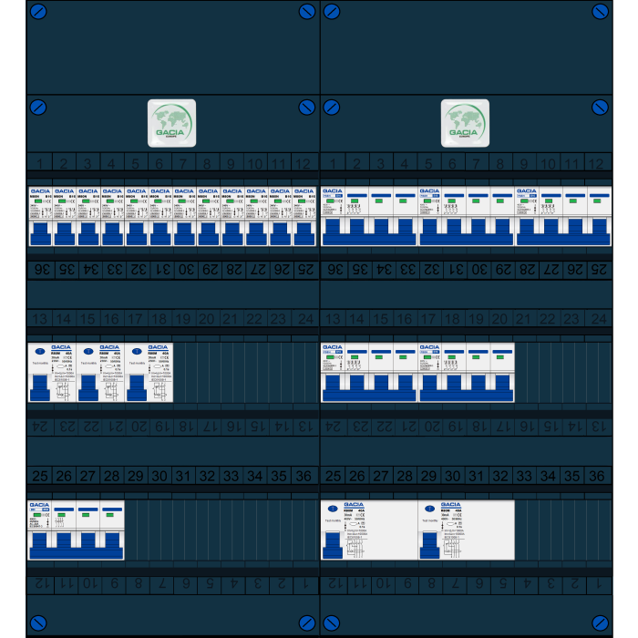 GACIA groepenkast, hoofdschakelaar, 3x aardlekschakelaar 2p/40/30mA, 2x aardlekschakelaar 4p/40A/30mA, 12x installatieautomaat 1p+n/B16, 5x installatieautomaat 3p+n/B16 (3 fase)