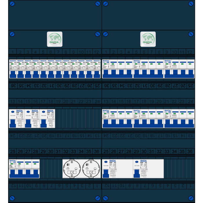 GACIA groepenkast, hoofdschakelaar, 3x aardlekschakelaar 2p/40/30mA, 2x aardlekschakelaar 4p/40A/30mA, 12x installatieautomaat 1p+n/B16, 6x installatieautomaat 3p+n/B16, tweevoudige contactdoos (3 fase)