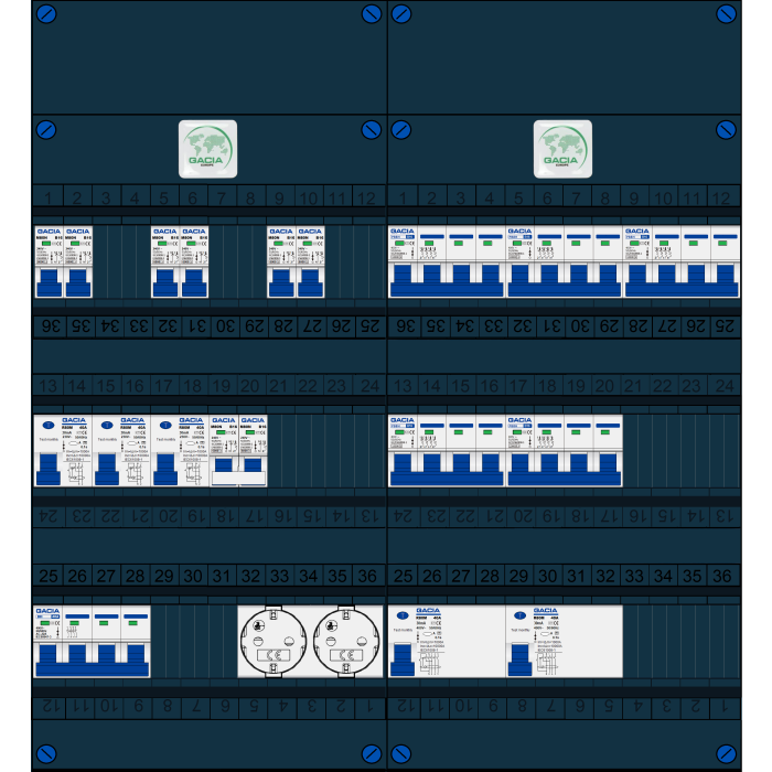 GACIA groepenkast, hoofdschakelaar, 3x aardlekschakelaar 2p/40/30mA, 2x aardlekschakelaar 4p/40A/30mA, 6x installatieautomaat 1p+n/B16, 5x installatieautomaat 3p+n/B16, kookgroep 2p+2n/B16, tweevoudige contactdoos (3 fase)