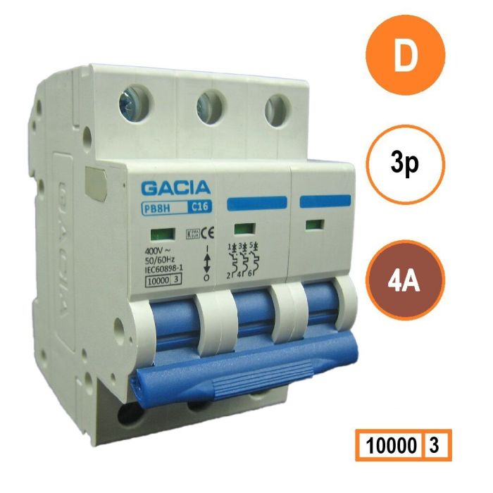 GACIA installatieautomaat 3p, D-karakteristiek, 4A, 10kA