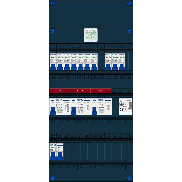 Met de GACIA GACK-B groepenkast is de installatie voorbereid op de toekomst. De aardlekschakelaars zijn uitgevoerd in de TYPE B variant waarmee niet alleen alle functies van een Type A maar ook vlakke DC-lekstromen, grotere pulserende gelijkstromen en gemengde frequenties tot 2000Hz worden gewaarborgd. Hiermee is de groepenkast compleet voorbereid op de nieuwe apparatuur waar power electronics worden toegepast. Doordat de breedte van 220mm gelijk is aan de oude groepenkast is het uitwisselen zeer eenvoudig en hoeft er weinig te worden aangepast. Buiten de standaard leverbare groepenkasten is het mogelijk om een klant-specifieke oplossing aan te vragen. Deze kasten zijn eenvoudig uit te breiden. Alle groepenkasten worden in eigen beheer geassembleerd en getest. Alle componenten worden onder spanning getest, de gebruikte aansluitmaterialen zijn specifiek ontworpen voor deze toepassing. Iedere schroef wordt met de hand aangedraaid op de juiste aandraaimoment.