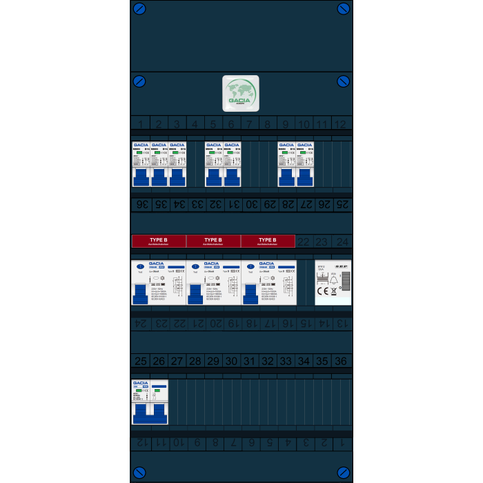 Met de GACIA GACK-B groepenkast is de installatie voorbereid op de toekomst. De aardlekschakelaars zijn uitgevoerd in de TYPE B variant waarmee niet alleen alle functies van een Type A maar ook vlakke DC-lekstromen, grotere pulserende gelijkstromen en gemengde frequenties tot 2000Hz worden gewaarborgd. Hiermee is de groepenkast compleet voorbereid op de nieuwe apparatuur waar power electronics worden toegepast. Doordat de breedte van 220mm gelijk is aan de oude groepenkast is het uitwisselen zeer eenvoudig en hoeft er weinig te worden aangepast. Buiten de standaard leverbare groepenkasten is het mogelijk om een klant-specifieke oplossing aan te vragen. Deze kasten zijn eenvoudig uit te breiden. Alle groepenkasten worden in eigen beheer geassembleerd en getest. Alle componenten worden onder spanning getest, de gebruikte aansluitmaterialen zijn specifiek ontworpen voor deze toepassing. Iedere schroef wordt met de hand aangedraaid op de juiste aandraaimoment.