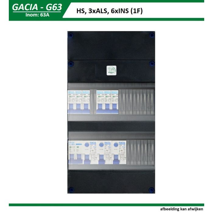 GACIA G63 groepenkast (1 fase), 1x Hoofdschakelaar 2p/63A, 3x Aardlekschakelaar 2p/63A/30mA, 6x Installatieautomaat 1p+n/B16