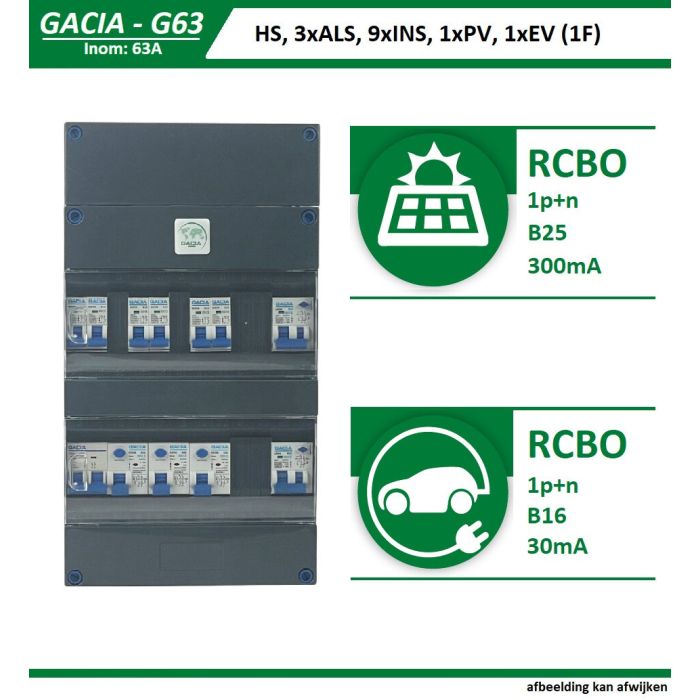 GACIA G63 groepenkast (1 fase), 1x Hoofdschakelaar 2p/63A, 3x Aardlekschakelaar 2p/63A/30mA, 9x Installatieautomaat 1p+n/B16, 1x Aardlekautomaat 1p+n/B25/300mA (PV), 1x Aardlekautomaat 1p+n/B16/30mA (EV)