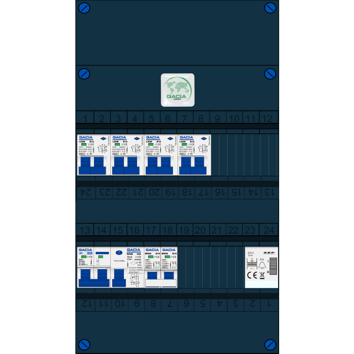 GACIA groepenkast, hoofdschakelaar, 4x aardlekautomaat, aardlekschakelaar+fornuisgroep, beltrafo (1 fase)