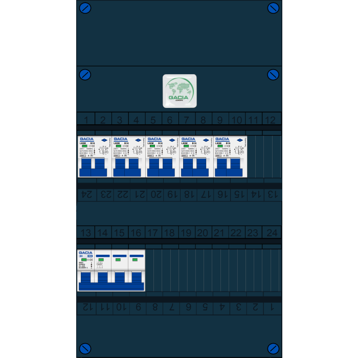 GACIA groepenkast, hoofdschakelaar, 5x aardlekautomaat (1/3 fase)
