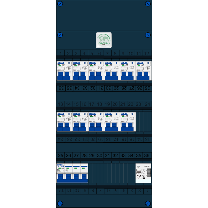 GACIA groepenkast, hoofdschakelaar, 11x aardlekautomaat, beltrafo (1/3 fase)