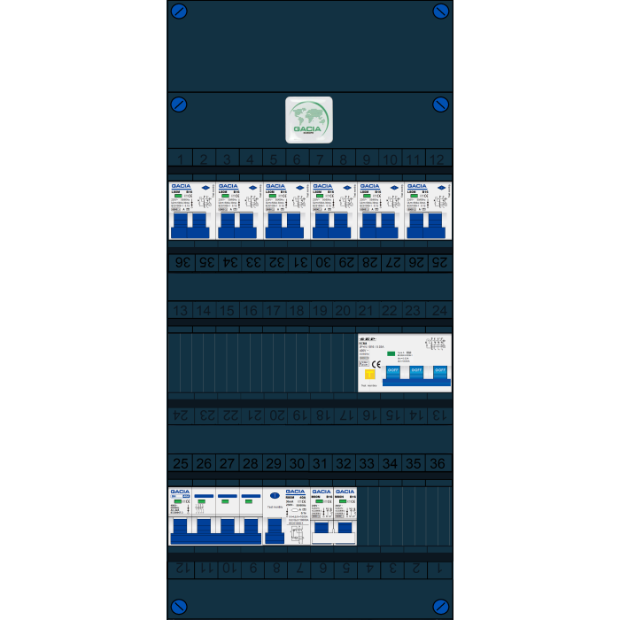 GACIA groepenkast, hoofdschakelaar, 6x aardlekautomaat, 1x kracht-aardlekautomaat, aardlekschakelaar+fornuisgroep (3 fase)