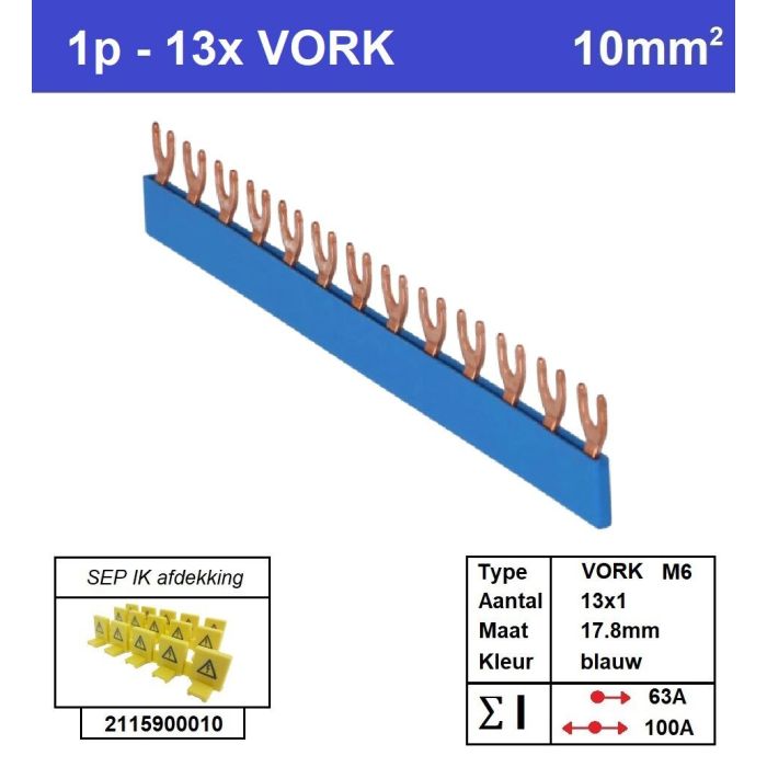 Geïsoleerde doorverbindingskam, 1 fase, 13x VORK, M6, 10mm2, 17,8mm, blauw