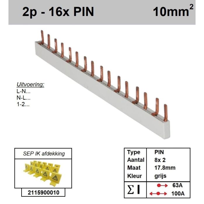 Geïsoleerde doorverbindingskam, 2 fase, 16x PIN, 10mm2, 17,8mm